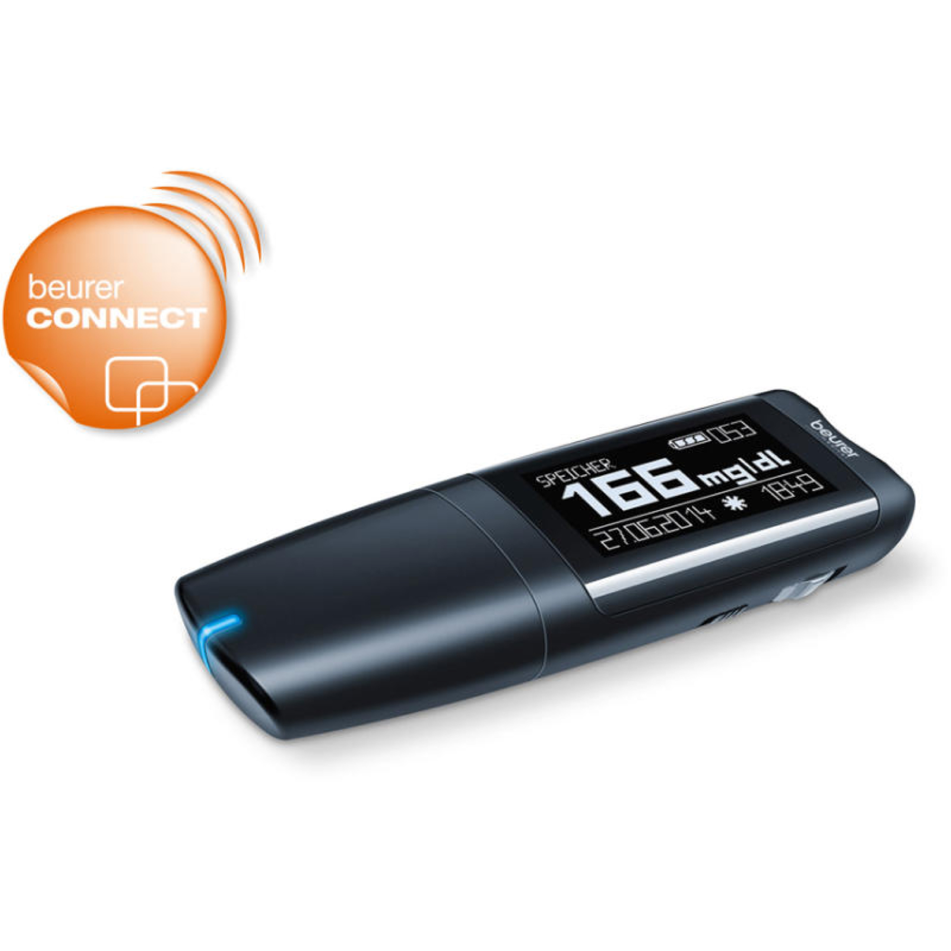 Příslušenství pro přenos a vyhodnocení dat, umožňuje přenos dat z Beurer GL50 EVO pomocí Bluetooth. Modrá LED kontrolka (součástí balení adaptéru není není přísroj GL50 EVO).
