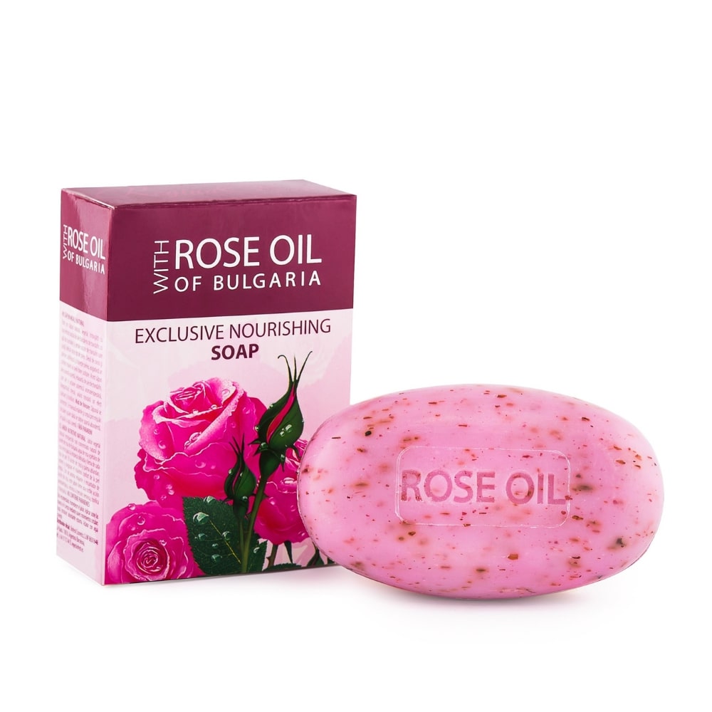 Exkluzivní, zvláčňující přírodní rostlinné mýdlo obohacené o koncentrát 100% bulharského růžového oleje, růžové vody a sušených okvětních plátků růží jemně a šetrně čistí všechny typy pokožky. Kokosový a palmový olej zjemňují, vyživují a zajišťují maximální komfort pro čerstvě vyčištěnou (omytou) pokožku. Díky uvolňující a okouzlující vůni růžového oleje má mýdlo silné aromaterapeutické účinky: odplavuje stres, odbourává nervové napětí, tonizuje, přináší pohodu a klid. Mýdlo je vynikající a vhodné pro všechny typy pokožky, zejména pro suchou a citlivou, a je antialergické.