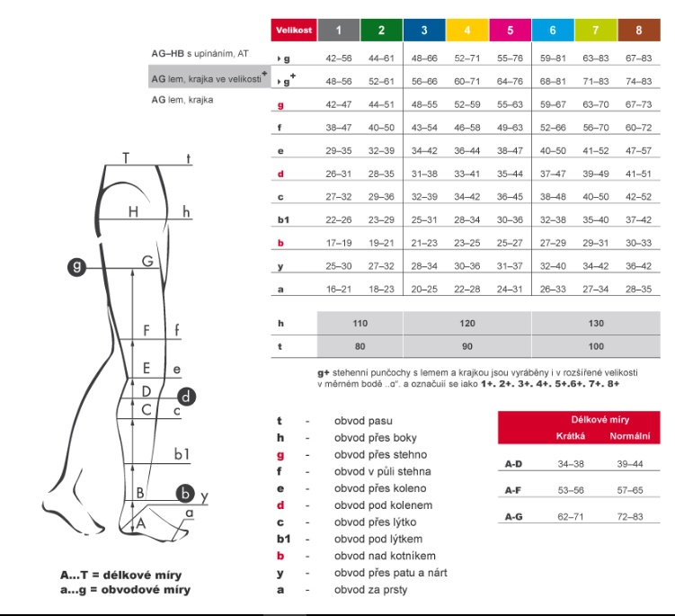 Při měření velikosti stehenních punčoch jsou důležité rozměry: b- obvod v nejsilnější části kotníku, g- obvod v nejsilnější části stehna, výška se měří od spodku chodidla až po stehno.