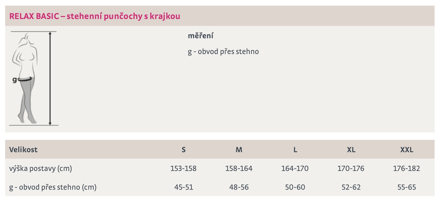 Popis: Základní řada podpůrných stehenních punčoch s lehkou kompresí v hladkém provedení pro ženy. Vhodné ke každodennímu nošení, při delším sezení a stání, při cestování apod.   Hlavní znaky: elegantní krajka se třemi silikonovými proužky (zabraňuje sklouzávání punčoch) dvě barevná provedení (svě... celý popis