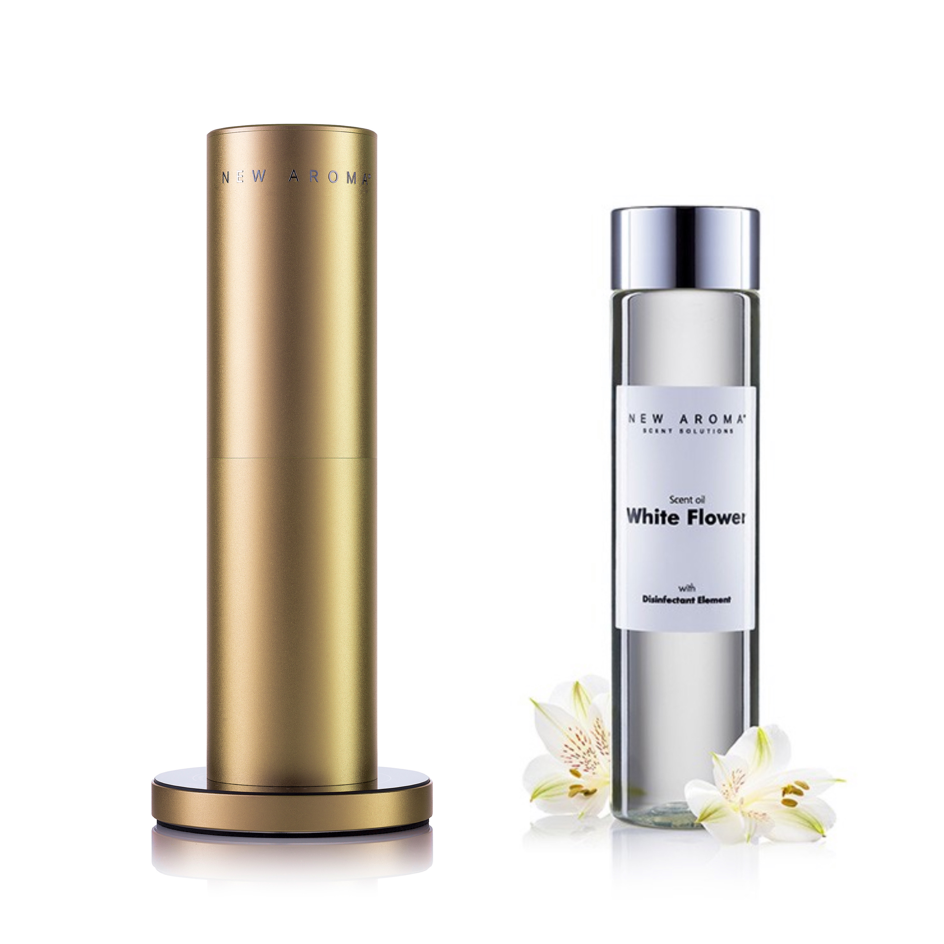 New Aroma difuzér Tower gold 100 m2 + 200 ml olej White Flower - dezinfekční aroma olej