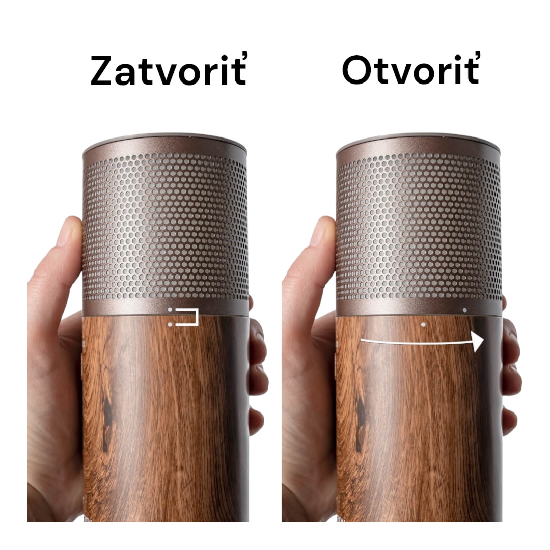 - Držte tělo, otočte horní část proti směru hodinových ručiček, abyste odemkli kovový kryt. Přidejte vodu do zásobníku, dokud nedosáhne ČERVENOU značku maxima vody. Nepřeplňujte. Přidejte 1-2 kapky vašeho oblíbeného esenciálního oleje do zásobníku vody. Nasaďte zpět kovový kryt a otočte jej ve směru hodinových ručiček, abyste jej zajistili, přičemž dbejte na to, aby byly zámkové značky zarovnány. Stisknutím tlačítka spustíte zařízení.