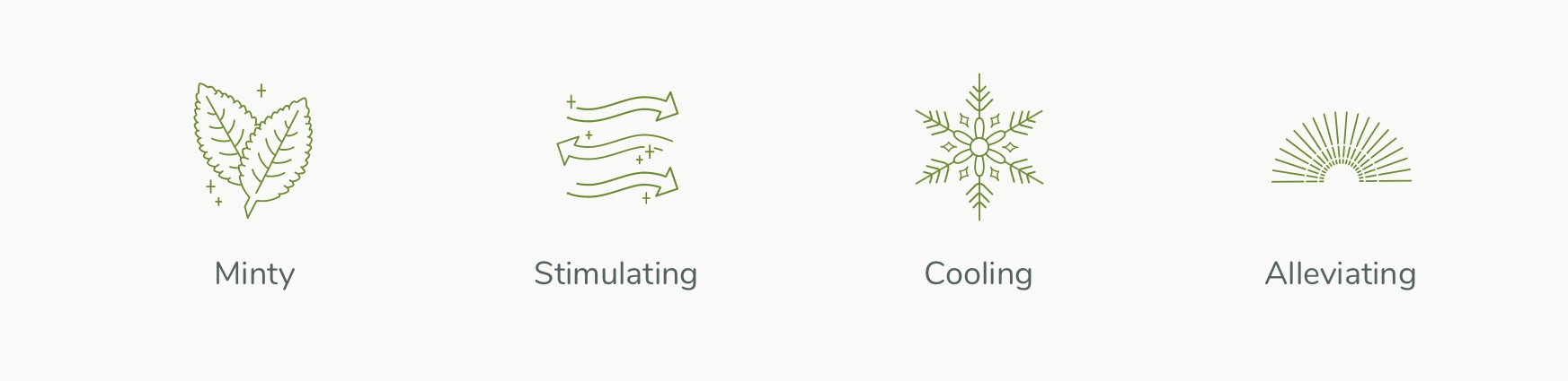 Její mátové, chladivé aroma má stimulující účinky, které mohou pomoci zvýšit bdělost a výdrž. Kdykoli se cítíte malátně, sáhněte po mátě peprné na polední dávku energie. Díky svým mentolovým vlastnostem dokáže při aplikaci na pokožku vyvolat chladivý pocit. Při napětí hlavy nebo krku rozřeďte mátu peprnou na nosný olej pro uklidňující masáž. Když se cítíte nevolno nebo potřebujete podporu pro zdraví dýchacích cest, může být užitečné nasávat jeho vůni prostřednictvím osobního inhalátoru.