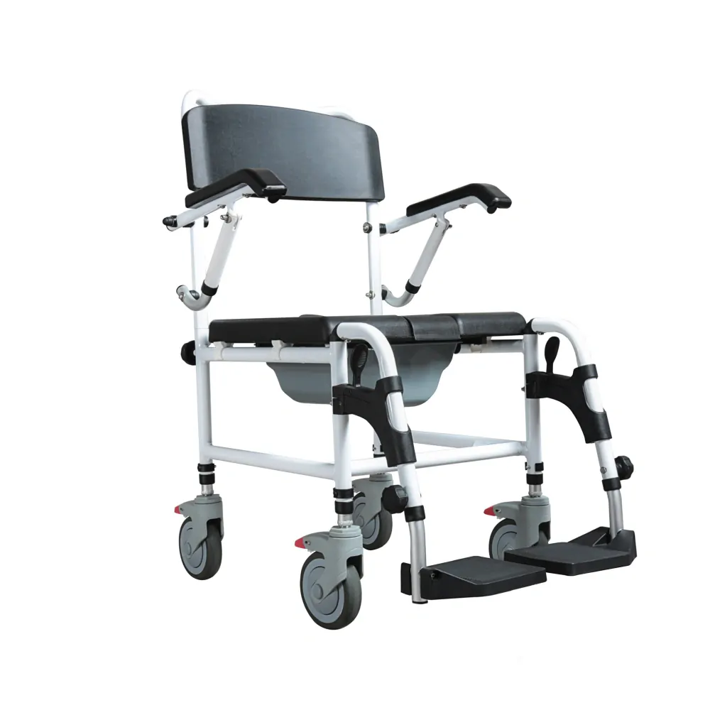 Přepravní sprchovací a taoletní křeslo - MASTER-TIM je vyrobeno z práškově lakovaného hliníkového rámu. Disponuje výklopnými loketními opěrkami pro snadné nastupování a vystupování pro osoby se sníženou pohyblivostí. Je vybavena sedadlem s klínem z PU, čtyřmi otočnými 5" koly s brzdou, sklopnými opěrkami na nohy a sanitární nádobou. Konstrukce židle umožňuje posouvání přes WC desku.